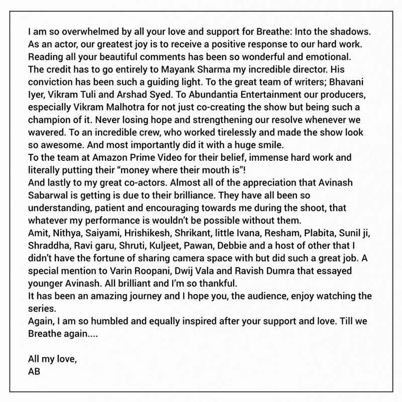 Overwhelmed by the wonderful response from his fans on social media towards Amazon Original Series Breathe: Into The Shadows, Abhishek Bachchan, posted a letter thanking them for their support. He mentioned in the letter, “I am so overwhelmed by all your love and support for Breathe: Into The Shadows. As an actor, our greatest joy is to receive a positive response to our Hardwork… It has been an amazing journey and I hope you, the audience, enjoy watching the series. I am so humbled and equally inspired after your support and love. Till we Breathe again…”