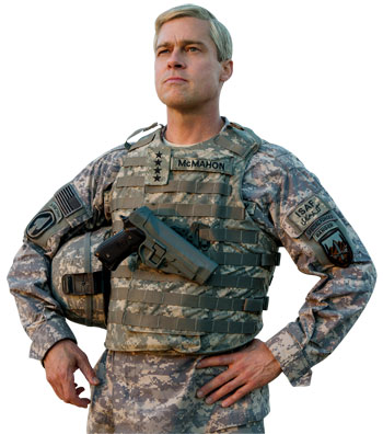 The tone of the book was far more forthright- strikingly different from the one you chose to highlight in the film! It wasn’t for financial reasons but because the other resistance I had to these dark stories was that they were all stories set on the battlefield with soldiers and I feel they are the only movies being made on war today. Those films are usually about the battlefield experiences and they don’t ask larger questions of the architects of those battles. What attracted me to Michael’s book was the fact that it was about the people who were actually dictating the war and not merely about those fighting it. It painted an overwhelming picture of delusion and vanity of men with an overblown sense of themselves. And that for me and Brad, said absurdity. From the earliest days of our discussions we started playing this movie as a war satire leading up to the ridiculous.