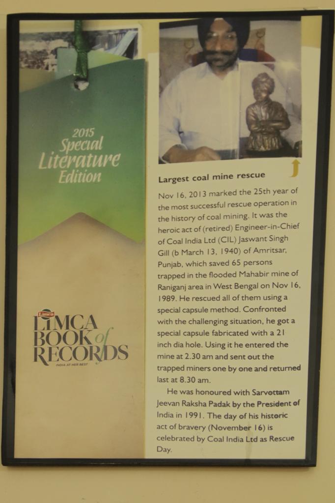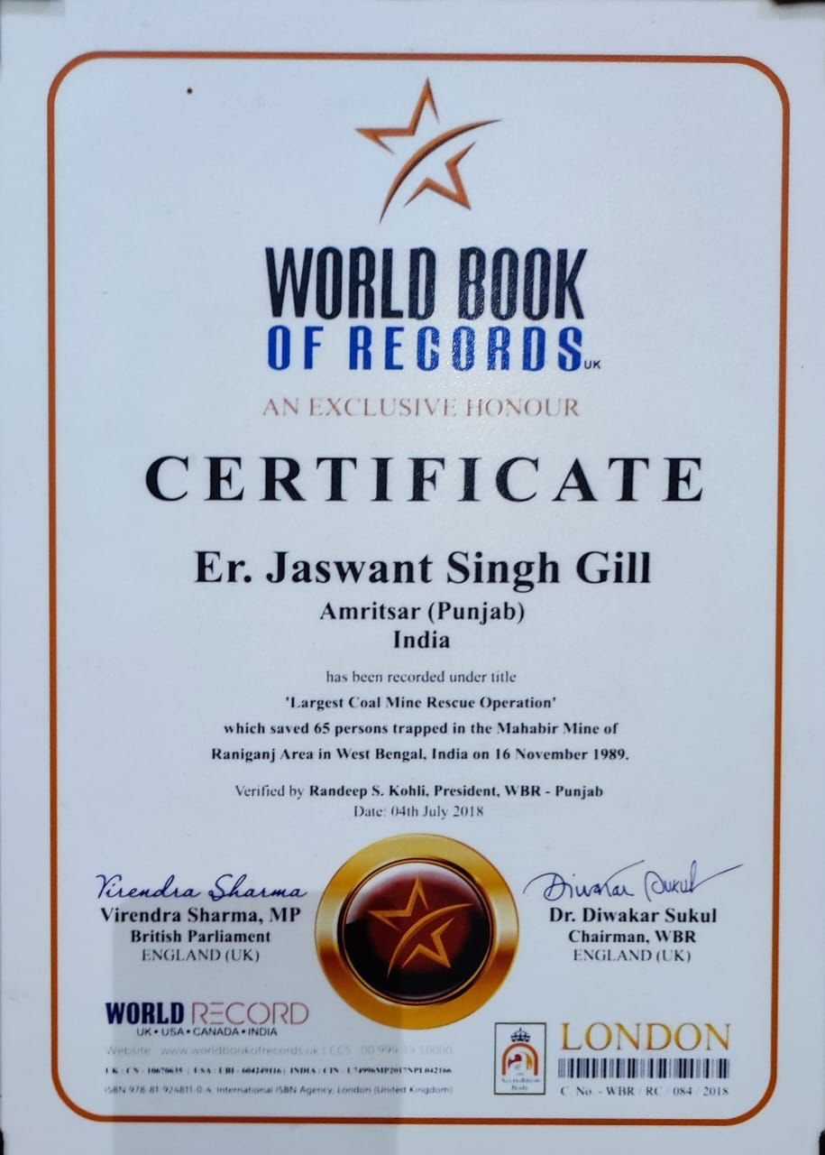 Late Sardar Jaswant Singh Gill holds “World Book of Records” and “Limca Book of Records” for successfully conducting World’s Largest Coal Mine Rescue Operation.