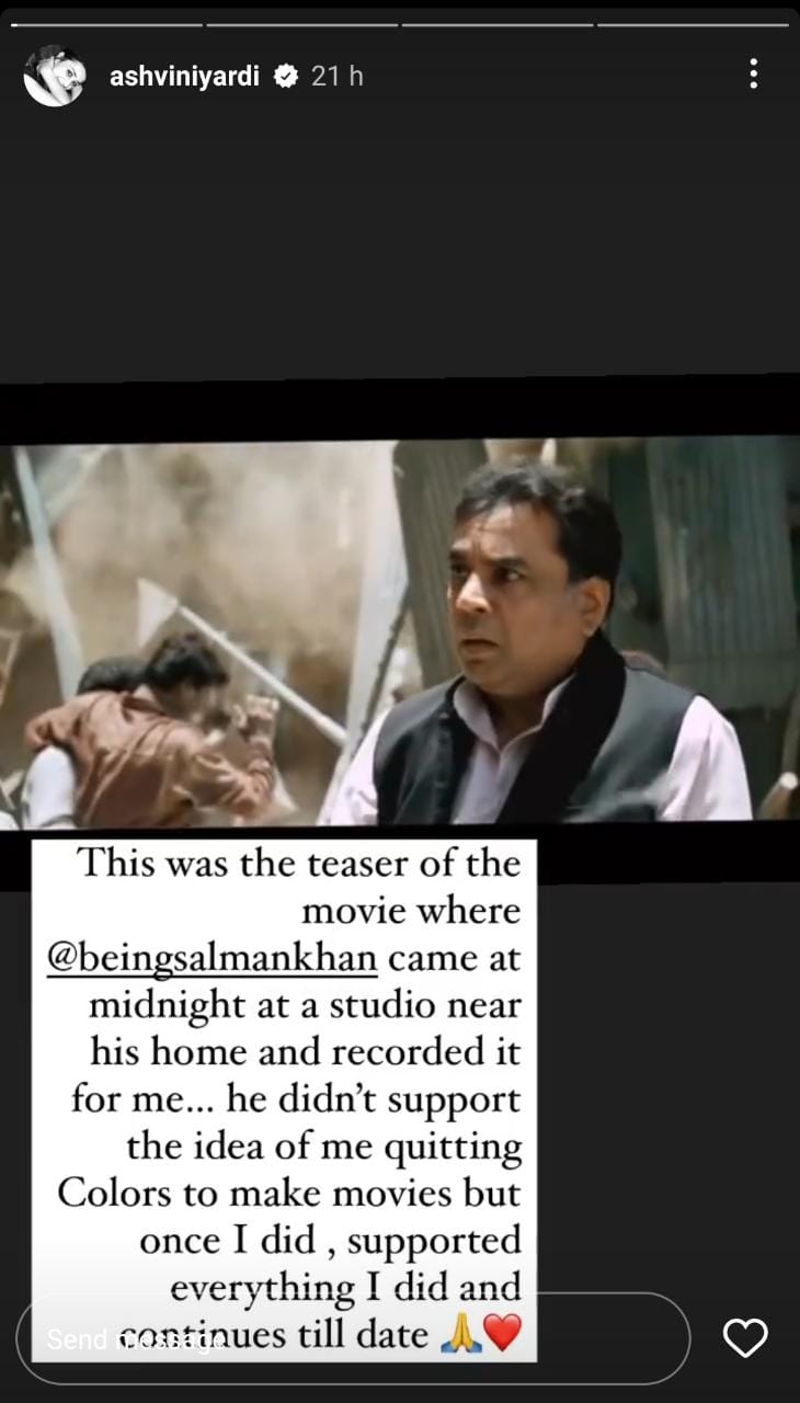 Recalling the dubbing of the teaser, Ashvini said, “This was the teaser of the movie where @beingsalmankhan came at midnight at a studio near his home and recorded it for me… he didn’t support the idea of me quitting Colors to make movies but once I did, supported everything I did and continues till date ❤️🙏🏻”.
