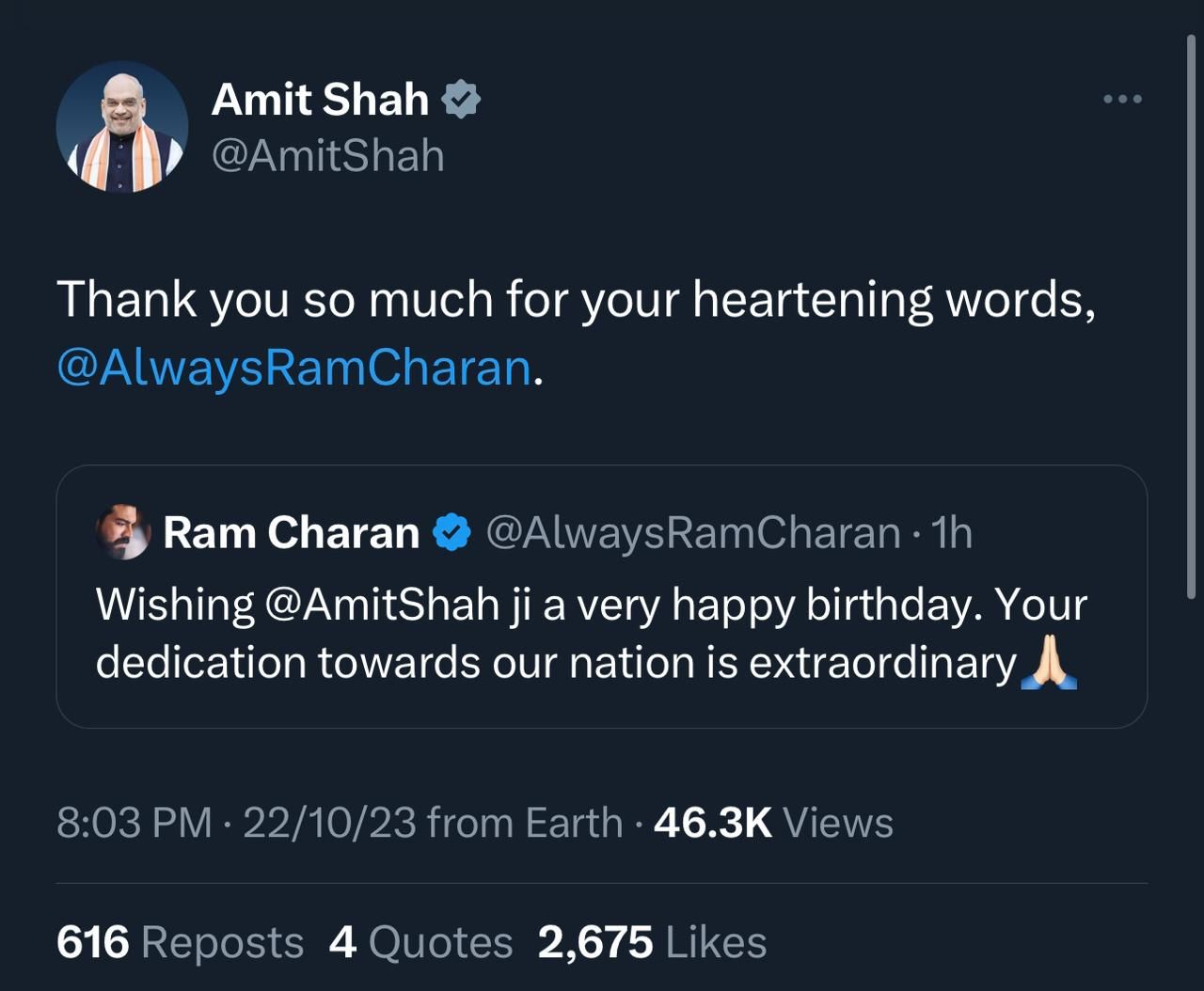 Ram Charan’s birthday message for Amit Shah was simple yet touching. The actor wrote, “Wishing @AmitShah ji a very happy birthday. Your dedication towards our nation is extraordinary.”