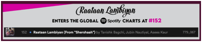 The song, Raataan Lambiyan which is currently trending on YouTube with 124 Million views enters the global Spotify charts at #152 and becomes the first ever Hindi song to achieve this milestone. Not just this, it’s a clean sweep across the Top 100 charts on iTunes as Ranjha reigns supreme over the others at the #1 spot while Raataan Lambiyan finds itself at #3 on the Apple charts.