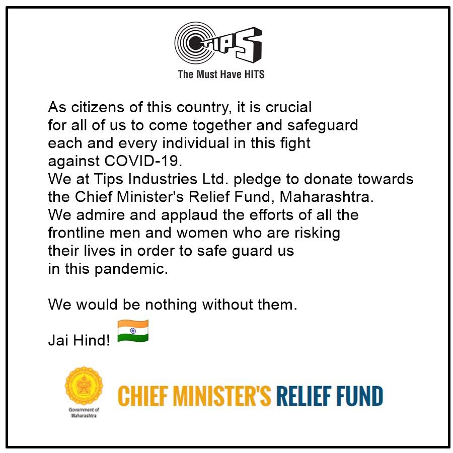 In their official statement, they said “As citizens of this country, it is crucial for all of us to come together and safeguard each and every individual in this fight against COVID-19. We at Tips Industries Ltd. pledge to donate towards the Chief Minister’s Relief Fund, Maharashtra. We admire and applaud the efforts of all the frontline men and women who are risking their lives in order to safe guard us in this pandemic. We would be nothing without them. Jai Hind”