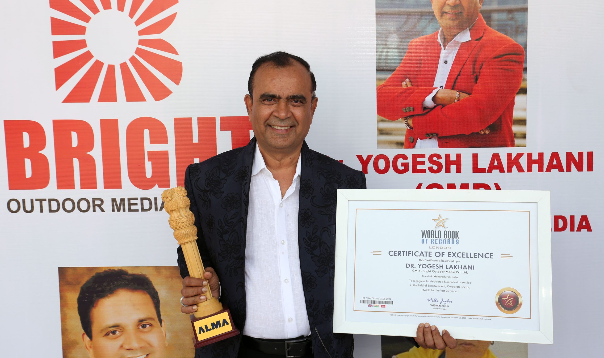 World Book Of Records, UK, an organization that catalogues and verifies extraordinary records across the world with authentic certification, has listed Dr. Yogesh Lakhani CMD, Bright Outdoor Media Pvt Ltd. for 2000 felicitation, 5000 awards internationally and catering to 1000 clients in fields of Entertainment Industry, Corporate sector, FMCG for 33 years.
